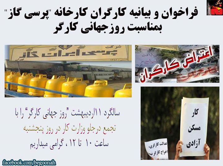 #بگونه : بمناسبت گرامیداشت روز جهانی کارگر،کارگران کارخانه پرسی گاز با انتشار بيانيه اي از عموم اقشار مردم برای شرکت در تجمع روز کارگر در روز پنجشنبه 10اردیبهشت، ساعت 10 صبح، در تهران مقابل وزارت کار رژیم، دعوت کردند و در بیانیه خود نوشتند: