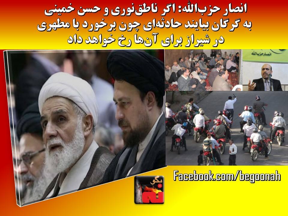 بگونه: چماقداران انصار حزبالله استان گلستان با انتشار بيانيه اي ناطقنوری و حسن خمینی را تهديد كردند چنانجه برای سخنرانی به گرگان بیایند، حادثهای چون برخورد با مطهری در شیراز برای آنها رخ خواهد داد.