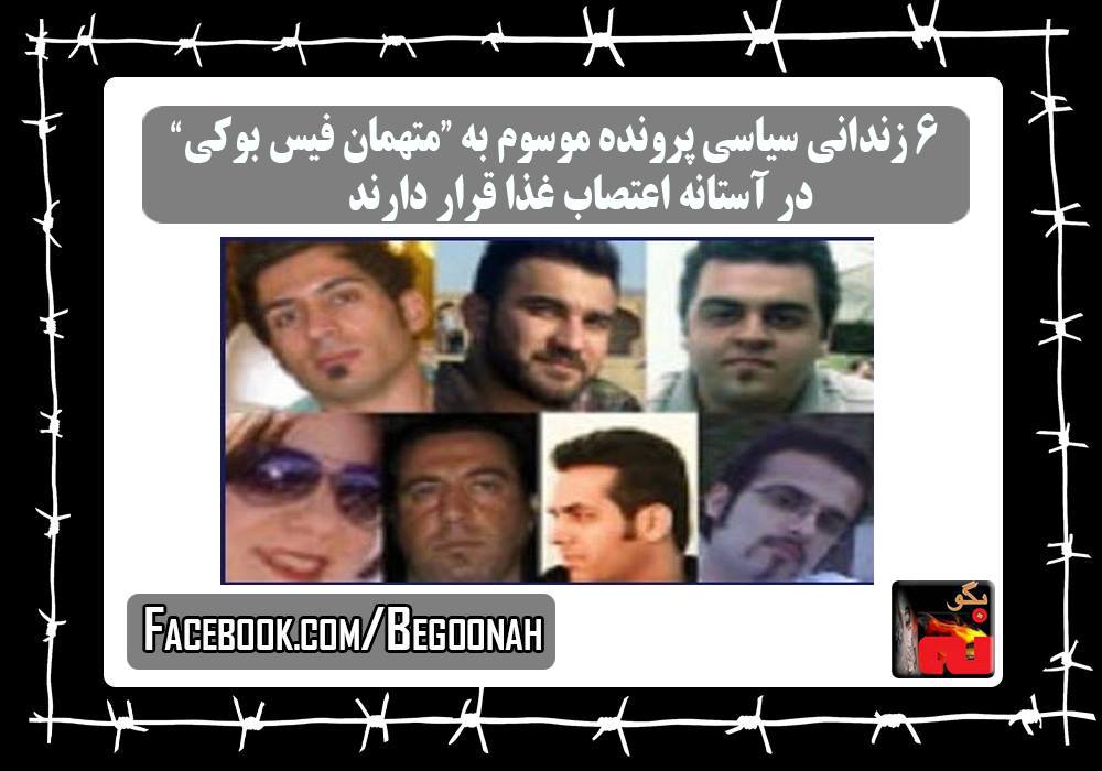 بگونه: شش زندانی پرونده موسوم به «متهمان فیس بوکی،در اعتراض به وضعیت وخیم در بند عمومی شامل زندانیان با جرائم عادی، و در اعتراض به اعمال فشار سپاه پاسداران در دادگاه که منجر به صدور احکام ناعادلانه برای آنان شده، در آستانه اعتصاب غذا قرار دارند.