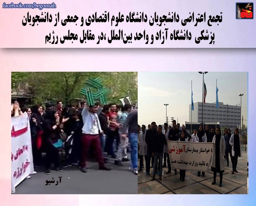 تجمع اعتراضی دانشجویان دانشگاه علوم اقتصادی و جمعی از دانشجویان پزشکی دانشگاه آزاد و واحد بینالملل ،در مقابل مجلس رژیم