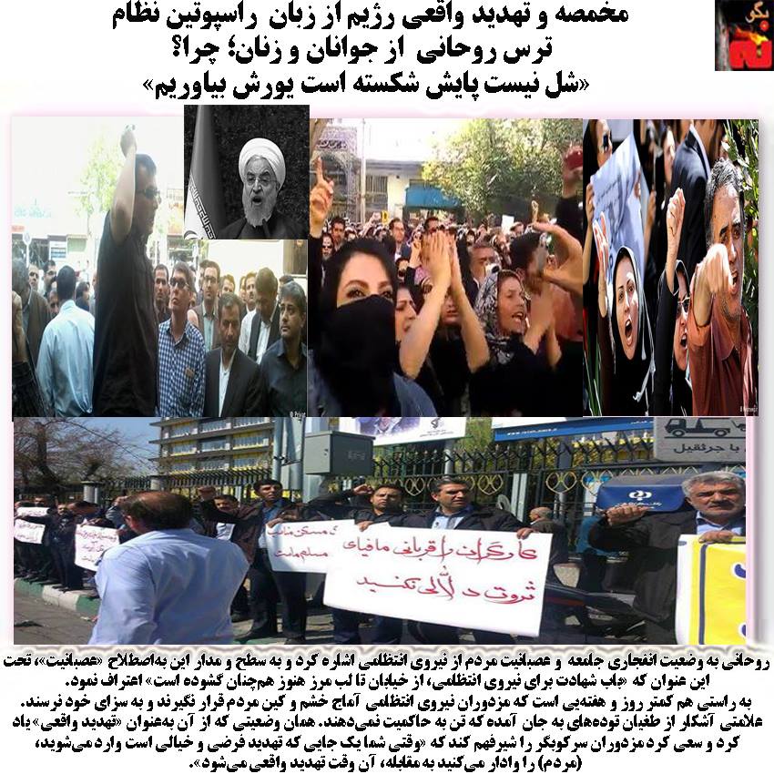 روحانی اشارات کاملاً آشکار و صریحی به وضعیت انفجاری جامعه داشت؛ آنجا که به عصبانیت مردم از نیروی انتظامی اشاره کرد و به سطح و مدار این بهاصطلاح «عصبانیت»، تحت این عنوان که «باب شهادت برای نیروی انتظامی، از خیابان تا لب مرز هنوز همچنان گشوده است» اعتراف نمود. به راستی هم کمتر روز و هفتهیی است که مزدوران نیروی انتظامی آماج خشم و کین مردم قرار نگیرند و به سزای خود نرسند. علامتی آشکار از طغیان تودههای به جان آمده که تن به حاکمیت نمیدهند. همان وضعیتی که روحانی از آن بهعنوان «تهدید واقعی» یاد کرد و سعی کرد مزدوران سرکوبگر را شیرفهم کند که «وقتی شما یک جایی که تهدید فرضی و خیالی است وارد میشوید، (مردم) را وادار میکنید به مقابله، آن وقت تهدید واقعی میشود».