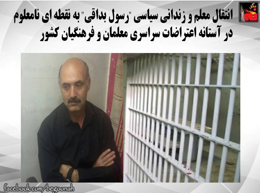 بگونه : بنا به گزارش « فعالین حقوق بشر و دمکراسی در ایران » روز یکشنبه ۶ اردیبهشت ماه و در آستانه روز ملی معلم ، معلم و زندانی سیاسی» رسول بداقی»تحت عنوان انتقال به دادسرای اوین از سالن ۱۲ بند ۴ زندان گوهردشت کرج خارج و به نقطه ای نامعلوم منتقل گردید. معلم زندانی رسول بداقی هفته گذشته به شعبه ۶ دادسرای انقلاب اوین منتقل و در آنجا به او اعلام گردید که دادستانی و وزارت اطلاعات علیه او شکایتی طرح کرده اند و فقط در صورت مصاحبه و اعلام کناره گیری از فعالیتهای صنفی معلمان این پرونده مختومه خواهد شد .