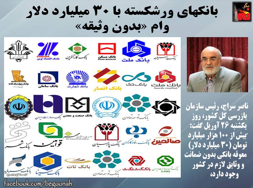 بگونه:رئیس سازمان بازرسی رژيم ايران اعلام كرد كه بانکهای این کشور 30 میلیارد دلار معوقات بانکی «بدون ضمانت و وثیقه» دارند.
