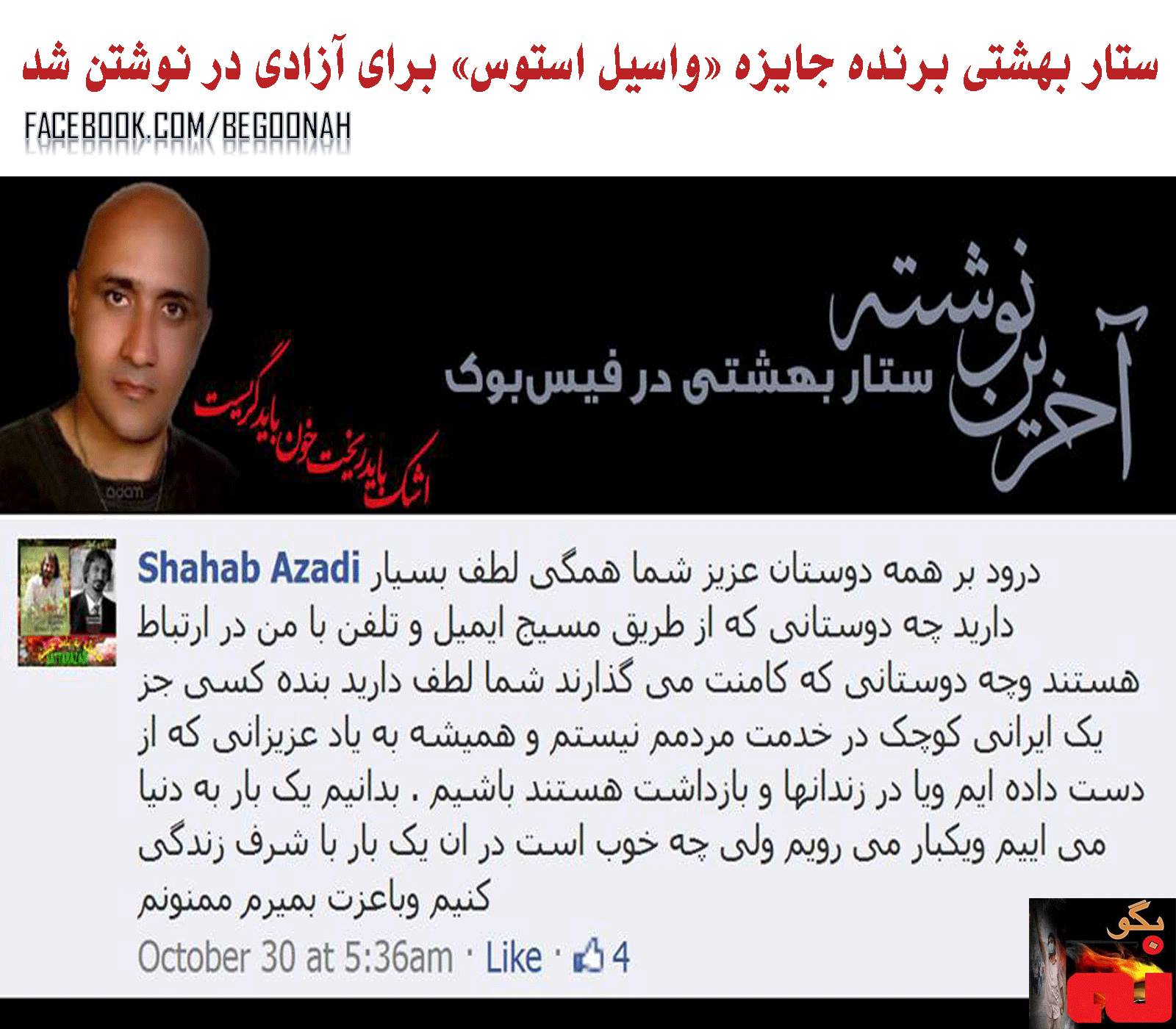 کمیته «آزادی قلم» مؤسسه پِن نیوانگلند اعلام کرد که جایزه امسال «واسیل استوس» برای آزادی در نوشتن، به ستار بهشتی وبلاگ نویس شهيد ایرانی اهدا شده است.