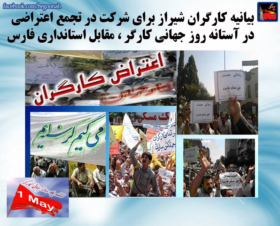 بیانیه کارگران شیراز برای شرکت در تجمع اعتراضی در آستانه روز جهانی کارگر ، مقابل استانداری فارس