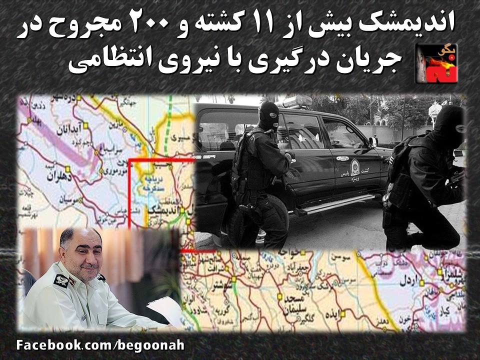 #بگونه: بهدنبال ورود نیروی انتظامی به یک درگیری محلی، بیش از یازده تن کشته و 200نفر مجروح شدند. این درگیری در روز چهارشنبه 9اردیبهشت 94 در محله قدیمی معروف به ساختمان شروع شد و با ورود مزدوران انتظامی دامنه گستردهتری پیدا کرد و تبدیل به جنگ مردم با نیروی انتظامی شد. سرکرده نیروی انتظامی خوزستان برای مهار خشم مردم از شهرهای شوش و دزفول نیروی ضدشورش به اندیمشک فرستاد. گفته میشود حداقل یک درجهدار نیروی انتظامی کشته شده و بیش از ده تن بهشدت مجروح شدند و حداقل به دو دستگاه خودروهای نیروهای انتظامی آسیب جدی وارد شد. شهر اندیمشک هماکنون حالت حکومت نظامی دارد.