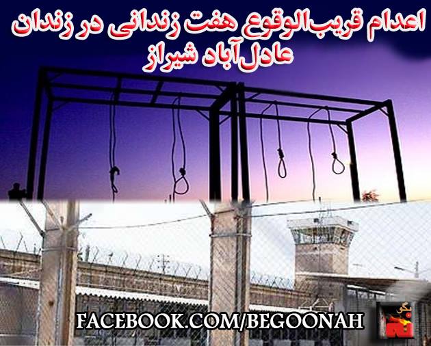بگونه :در ادامه ایجاد رعب و وحشت در ترس از اعتراضات و خیزشهای اعتراضی مأموران رژیم ضدبشری امروز سهشنبه 15اردیبهشت 94 هفت زندانی را برای اجرای حکم اعدام از زندان پیرنیا به سلولهای انفرادی زندان عادلآباد شیراز منتقل کردند. خطر اعدام این هفتتن قریبالوقوع است.