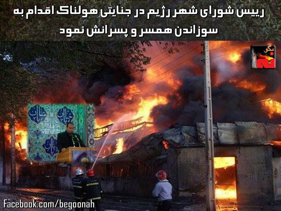 بنابر گزارش رسیده , مرتضی علی عسگری رییس شورای اسلامی رژیم در شهرکلاچای با ریختن بنزین همسر ۳۵ ساله و ۲ پسر ۵ و ۸ ساله اش را به آتش کشاند.