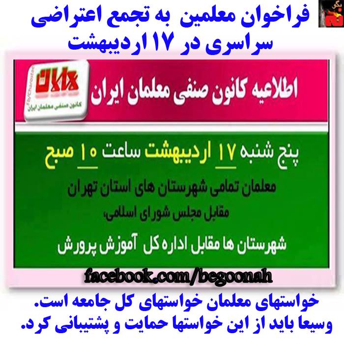 #بگونه: معلمان برای پیگیری خواستهایشان، فراخوان به تجمع اعتراضی سراسری در ١٧ اردیبهشت داده اند. وسیعا اطلاع رسانی کنیم.