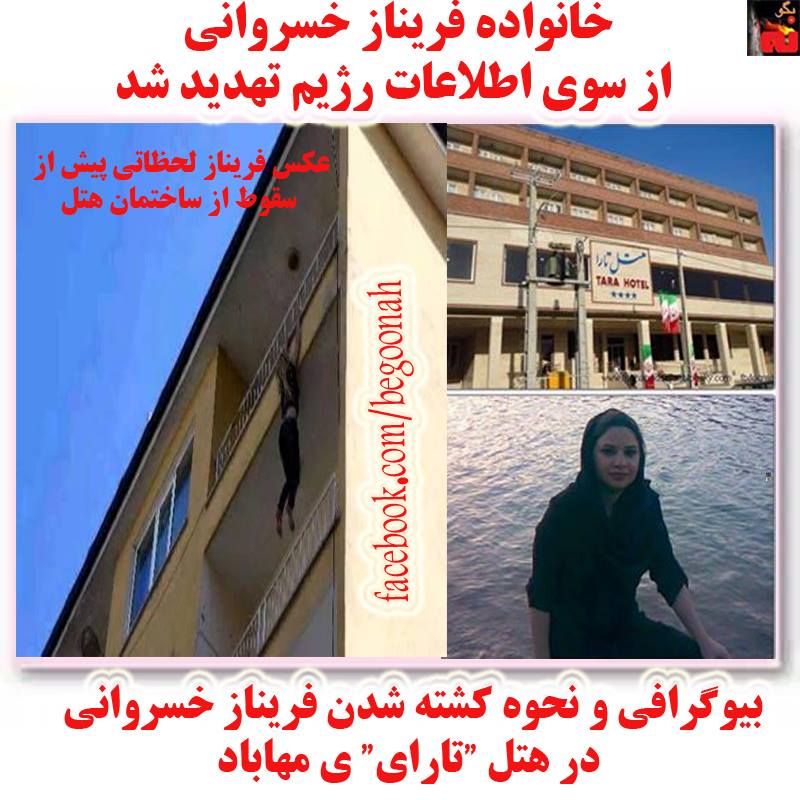 #بگونه: در پي خشم مردم مهاباد از قتل ” فريناز خسرواني” كه مهماندار هتل ”تاراي” مهاباد بود و روز دوشنبه ۱۴ اردیبهشتماه سال ۱۳۹۴ از سوی صاحب هتل، تبانی تجاوز به وی از سوی یک مامور اطلاعاتی صورت گرفته بود، در پی حملهی مامور اطلاعاتی و بستن دربها از سوی صاحب هتل، مجبور به پریدن از پنجرهی طبقهی چهارم هتل شده و جان خود را از دست داد .