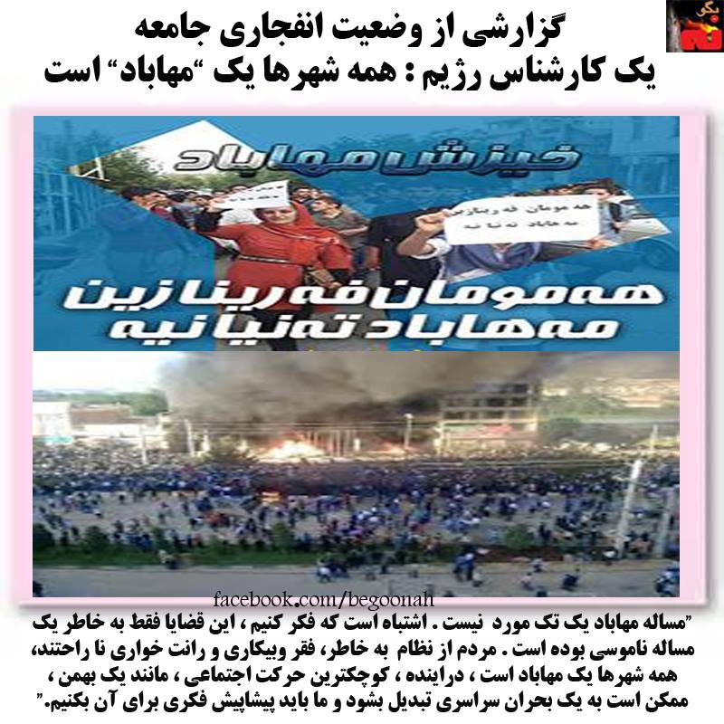 يك كارشناس ديگر رژيم ضمن تاييد نظرات نفر قبلي گفته است ،مساله مهاباد يك تك مورد نيست . اشتباه است كه فكر كنيم ، اين قضايا فقط به خاطر يك مساله ناموسي بوده است . مردم از نظام به خاطر، فقر وبيكاري و رانت خواري نا راحتند، متاسفانه وعده هاي داده شده آقاي روحاني هم كه هنوز عملي نشده است . درشرايطي كه بسر مي بريم . همه شهرها يك مهاباد است ، دراينده ، كوچكترين حركت اجتماعي ، مانند يك بهمن ، ممكن است به يك بحران سراسري تبديل بشود و ما بايد پيشاپيش فكري براي آن بكنيم.