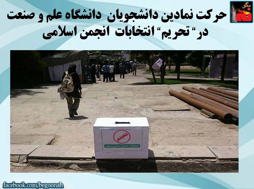 #بگونه : بنا به خبر دریافتی ، روز سه شنبه ۲۲ اردیبهشت، جمعی از دانشجویان علم و صنعت در حرکتی نمادین تعدادی صندوق رای با علامت «تحریم» را در سطح دانشگاه توزیع کردند و از کلیه دانشجویان خواستند تا مشخص شدن وضعیت نهادها و تشکلهای دانشجویی، در انتخابات انجمن اسلامی مشارکت نکنند.