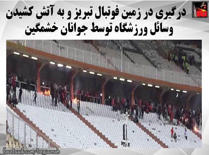 #بگونه : بنا به گزارشات رسیده ،پس از پایان بازی تیمهای تراکتورسازی تبریز و نفت تهران جوانان خشمگین تبریز در اعتراض به نتیجه بازی با مأموران درگیر شدند و وسائل ورزشگاه را به آتش کشیدند