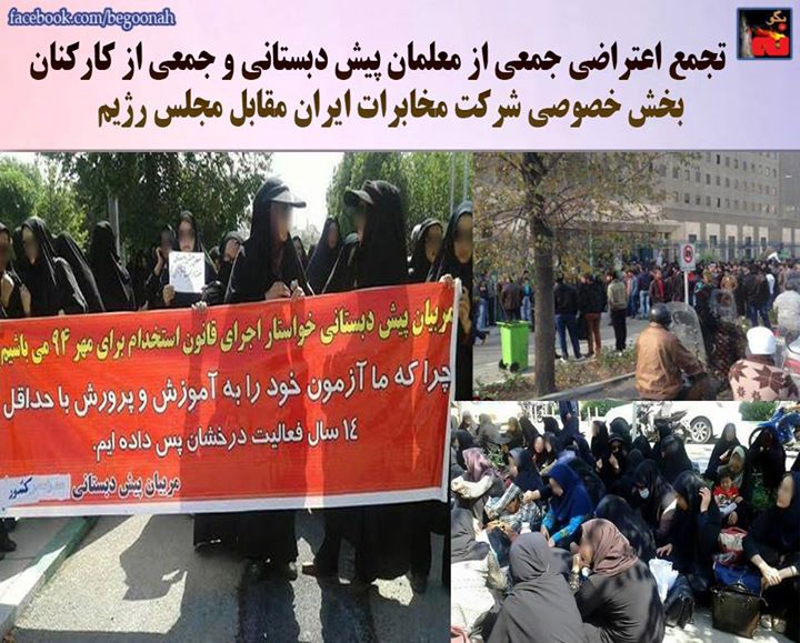 تجمع اعتراضی جمعی از معلمان پیش دبستانی و جمعی از کارکنان بخش خصوصی شرکت مخابرات ایران مقابل مجلس رژیم