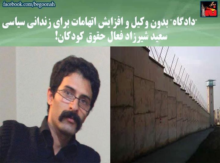 #بگونه: آقای سعید شیرزاد در خرداد ماه سال ٩٣ در محل کار خود در پالایشگاه تبریز بازداشت شد. اتهامات آقای شیرزاد تبلیغ علیه نظام و اقدام علیه امنیت ملی از طریق اجتماع و تبانی عنوان شده بود ولی اینک اتهام جدیدى با عنوان “اخلال در نظم عمومى از طریق سر دادن شعارهاى نامتعارف” نیزبه ایشان افزوده شده که قبلا در پرونده موجود نبوده است.