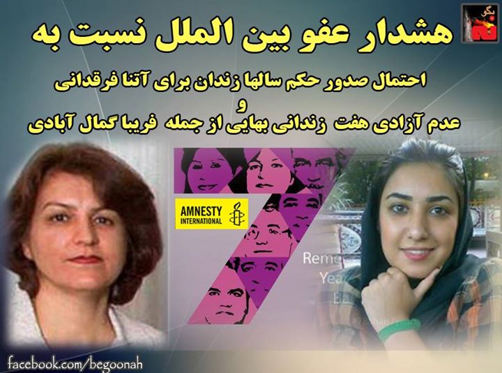 #بگونه: عفو بین الملل خواستار آزادی آتنا فرقدانی هنرمند 28 ساله ای که بدلیل کشیدن کاریکاتورهای انتقادی بازداشت شده و همچنین هفت تن از رهبران بهایی زندانی بعد از گذشت هفت سال حبس شد.