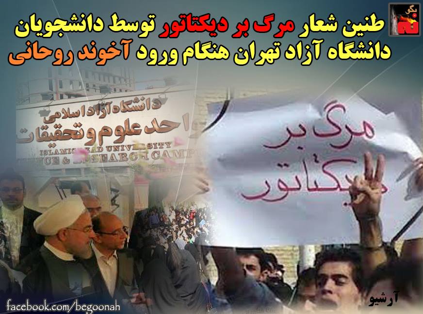 #بگونه: به گزارش رسيده ساعت۱۱صبح امروز سهشنبه ۲۹اردیبهشت ۹۴ برابر با۱۹ مي ۲۰۱۵ , هنگام رفتن آخوند روحانی به دانشگاه آزاد تهران ـ واحد علوم و تحقیقات، دانشجویان در قسمت مرکز فیزیک پلاسما تجمع کردند و شعار مرگ بر دیکتاتور سردادند.