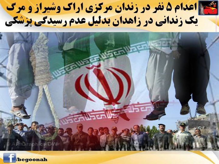 بنا بر اخبار رسیده به منابع حقوق بشری، یک زندانی به نام حسین- ع، صبح امروز در شیراز در ملا عام و چهار زندانی در زندان مرکزی اراک بنامهای “عبدالرحمن ـ ش ”، “عیسی – ب ”، “علیرضا – ب ” و “احمدرضا – م ” به دار آویخته شدند.