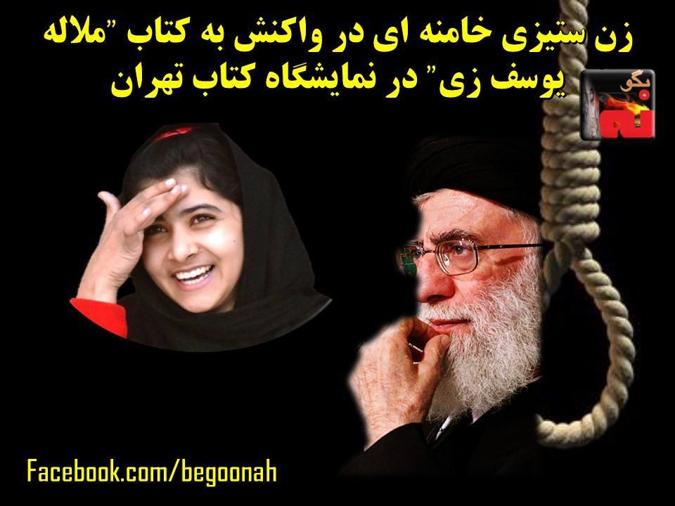 آخوندخامنهای،رهبر طلسم شکسته نظام آخوندی، هنگام بازدید از غرفههای کتاب در نمایشگاه کتاب تهران به کتابی برخورد میکند که تصویر «ملاله یوسفزی» بر جلد دارد. علی خامنهای رو به اطرافیان و همراهان کرده و با نشاندادن کتاب میگوید: «این دختر پاکستانی را هم دارند در دنیا بزرگ میکنند».