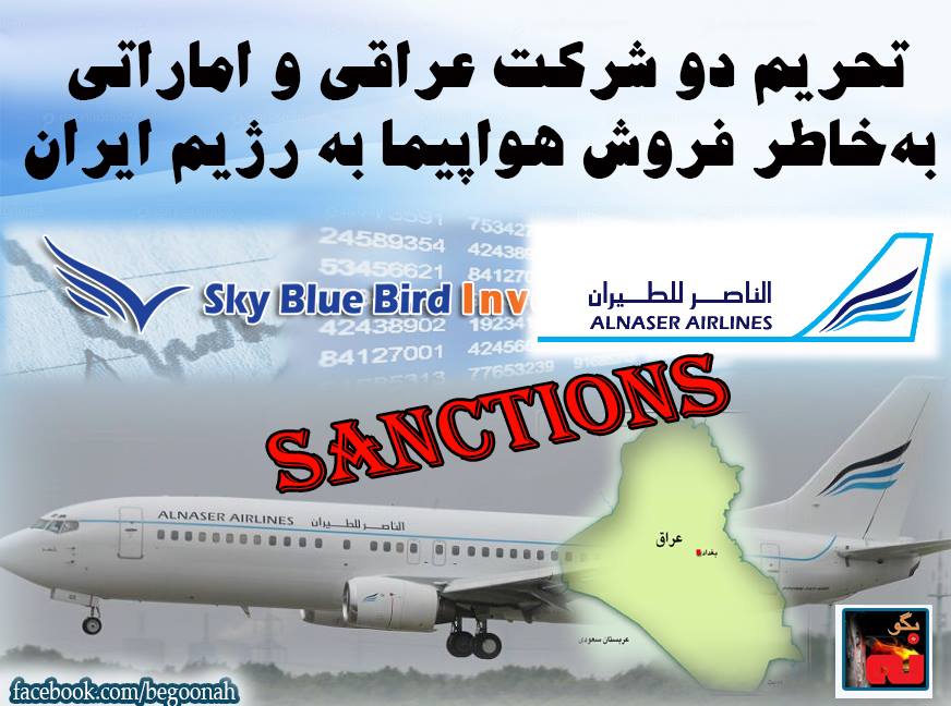 #بگونه: وزارت دارایی آمریکا شرکت عراقی «الناصر ایرلاینز» و شرکت «اسکای بلوبرد» در امارات متحده عربی را به خاطر ارتباط با رژیم ایران از طریق شرکت هواپیمایی ماهان برای خرید هواپیماهای دست دوم را تحریم کرد.
