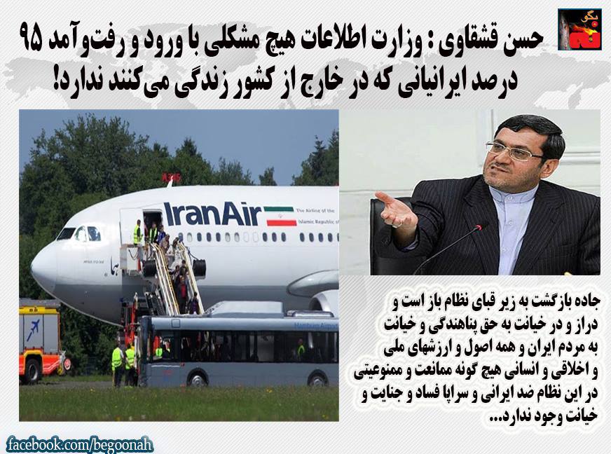 #بگونه :حسن قشقاوي كارچاق كن و دلال مسافرين اتوبان وزارت اطلاعات رژيم آخوندي در مصاحبه با رسانه حكومتي ايسنا در ادامه درباغ سبز نشان دادن به ايرانيان خارج از كشور براي بازگشت به زير قباي نظام با وقاحت تمام اعلام كرد” ما ممنوعالورود نداریم و وزارت اطلاعات، قوه قضائیه و وزارت امور خارجه، هیچ مشکلی با ورود و رفتوآمد ۹۵ درصد ایرانیانی که در خارج از کشور زندگی میکنند ندارند.