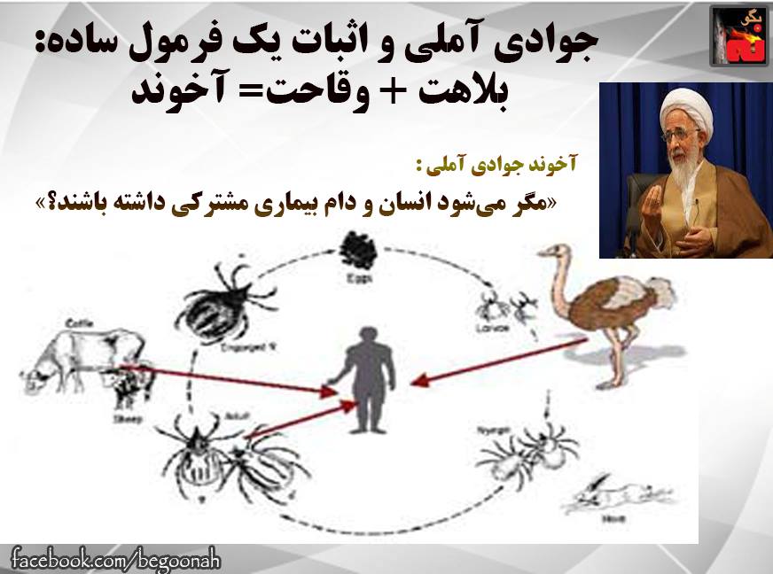 #بگونه: آخوند جوادي آملي یکی از مراجع تقلید حوزه هاي جهل و جنايت در قم با انتقاد از برگزاری همایشهایی با موضوع بیماری های مشترک «انسان و دام» فرمول ساده بلاهت + وقاحت = آخوند را به اثبات رساند و گفت: «مگر میشود انسان و دام بیماری مشترکی داشته باشند؟»