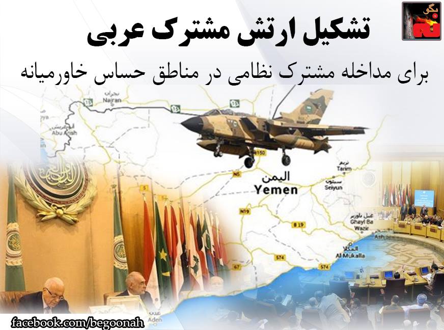 #بگونه: به گزارش خبرگزاری آسوشیتدپرس رؤسای ستاد مشترک ارتش کشورهای عربی روز یکشنبه (۳ خرداد / ۲۴ مه) در اجلاسی در قاهره به تنظیم پیشنویس قطعنامهای در ارتباط با تشکیل ارتشی مشترک از کشورهای عرب منطقه برای مداخله مشترک نظامی در مناطق حساس خاورمیانه پرداختند. بنابه اين گزارش،در پیشنویس تشکیل ارتش مشترک عربی که توسط رؤسای ستاد مشترک ارتش کشورهای عربی تهیه شده، هدف این ارتش مشترک «مبارزه با گروههای افراطی در منطقه» است. گفته شده که از جمله این افراط گرایان، گروههایی هستند که از جمهوری اسلامی ایران طرفداری میکنند.