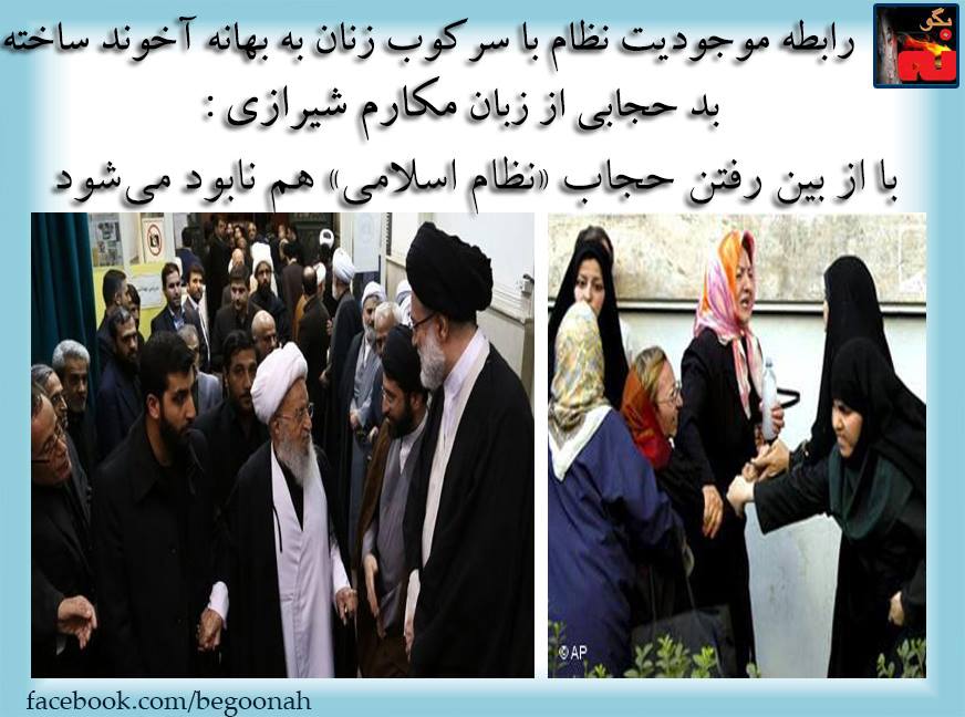بگونه: آخوند مكارم شيرازي از مراجع تقلید در حوزه هاي جهل و جنايت و فساد درقم كه يكي از مصاديق فرمول بسيار ساده : بلاهت + وقاحت = با آخوند مي باشد، رابطه موجوديت نظام زن ستيز ولايت فقيه با سركوب زنان به بهانه آخوند ساخته بد حجابي را به روشني بيان نموده و گفته است: با از بین رفتن حجاب، نظام اسلامی هم نابود میشود.