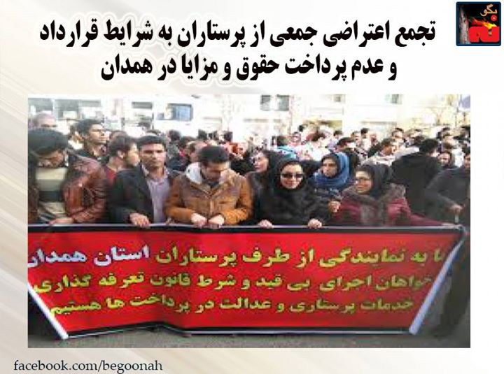 #بگونه: همگام با اعتراضات سراسری معلمان ، کارگران و دیگر اقشار بستوه آمده از فقر و گرانی و تورم و مشکلات کاری ناشی از سو مدیریتها و وجود فسادهای گسترده در نظام آخوندی که هر یک از کارگزاران را نه تنها ملزم به یاری رساندن و پیشبرد درست کارها نمی کند که تنها به اختلاس و دزدی و دور زدن مردم می اندیشند. در همین راستا در اعتراض به شرایط قرارداد و عدم پرداخت حقوق و مزایا جمعی از پرستاران استخدام شرکتی علوم پزشکی همدان در مقابل ساختمان علوم پزشکی همدان تجمع اعتراضی برپا کردند. گفته میشود این پرستاران حقوق و مزایای و بیمهٔ ماههای اسفند، فرردین و اردیبهشت را دریافت نکردهاند.
