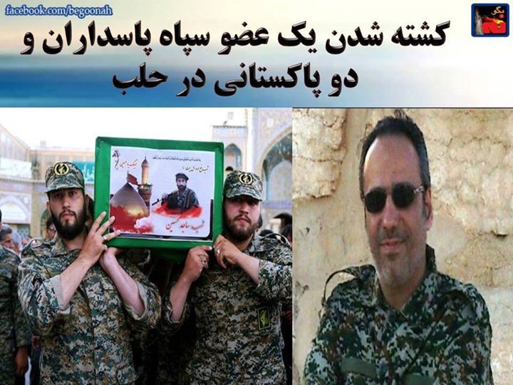 #بگونه: رسانه هاى نزديك به سپاه پاسداران ايران از كشته شدن يك عضوسپاه به نام » على اصغر شيردل» و دو برادر پاكستانى به نام هاى «ساجد حسين» و «اخلاق حسين» از تيپ «زينبيون» در درگيريهاى حلب در شمال سوريه خبر دادند.