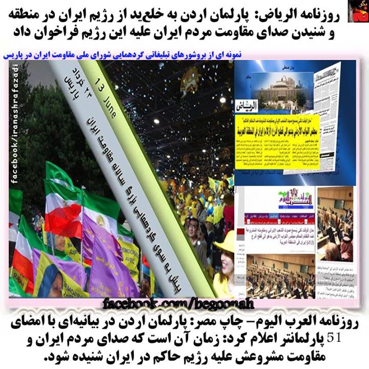 #بگونه:در آستانه برگزاری گردهمایی بزرگ سالانه شوراي ملي مقاومت ایران در سالن ويلپنت در پاریس، روزنامه الرياض چاپ عربستان سعودي و روزنامه العرب اليوم چاپ مصر از فراخوان 51تن از نمایندگان پارلمان اردن براي خلع يد از رژيم ايران در منطقه و شنيدن صداي مقاومت مشروع مردم ايران عليه اين رژيم خبر دادند.