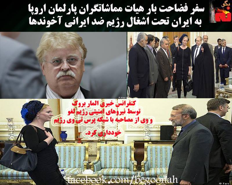 #بگونه: به گزارش راديو آلمان كه سياست مماشاتگرانه وزارت خارجه آلمان را با الطاف فراوان و توجهات بسيار به رژيم آخوندها بويژه در رابطه با دخالت هاي رژيم در كشورهاي منطقه مانند يمن، سوريه و عراق و مذاكرات اتمي بازتاب ميدهد، روز شنبه (۱۶ خرداد/ ۶ ژوئن) المار بروک، رئیس کمیته کمیسیون روابط خارجی پارلمان اروپا، به همراه یک هیئت ۷ نفره به ايران تحت اشغال رژيم ضد ايراني آخوندها سفر وبا شماری از نمایندگان مجلس رژيم و پاسدار علی لاریجانی، رئیس مجلس، دیدار کرد.