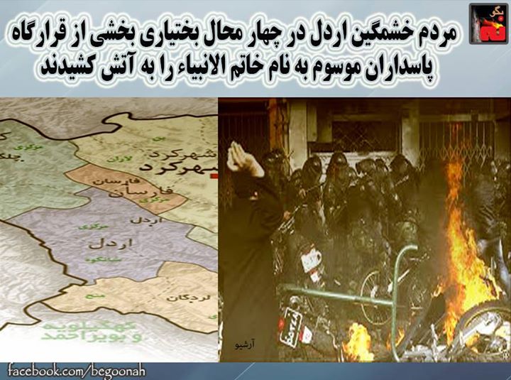 #بگونه : بنابه گزارش رسيده گروهي از اهالی شهرستان اردل در استان چهار محال بختياري به مقر سپاه پاسداران رژيم در قرارگاه موسوم به خاتم الانبیاء حمله کردند و بخشی از تجهیزات آن را به آتش کشیدند.