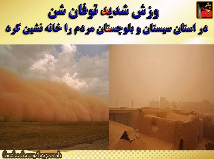 #بگونه: بنا به گزارش رادیو آلمان، بسیاری از مردم سیستان سهشنبه (۱۹ خرداد / ۹ ژوئن) ترجیح دادهاند از خانههای خود خارج نشوند و با وجود گرمای بیش از ۴۰ درجه برای در امان ماندن از خاک و شن، درها و پنجرهها را به روی طبیعت ببندند .وزش شدید توفان شن مانع جریان عادی زندگی در منطقه سیستان شده است. غلظت گرد و خاک در این منطقه به ۲۵ برابر حد مجاز و هشت برابر حد بحرانی رسیده است.