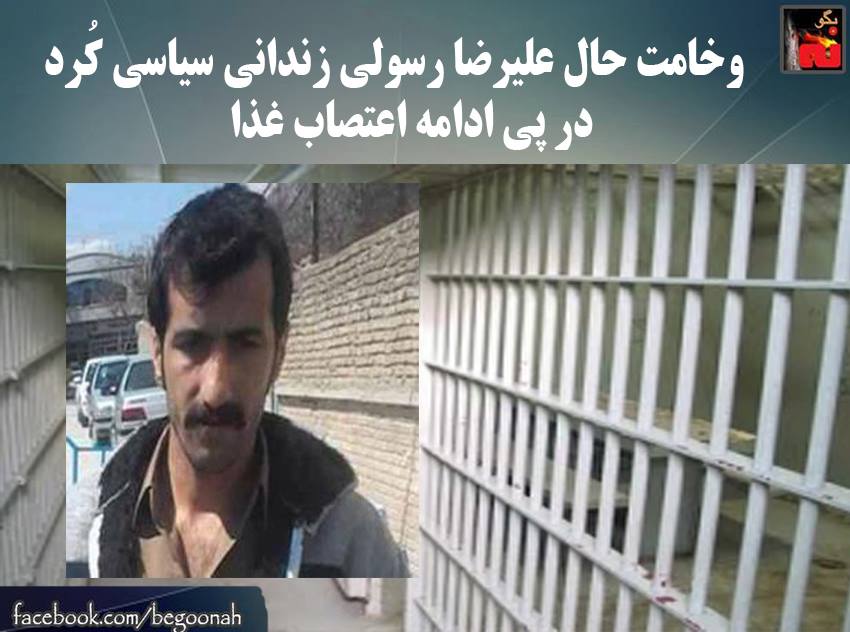 #بگونه : بنا به گزارش کمپین دفاع از زندانیان سیاسی و مدنی،علیرضا رسولی زندانی سیاسی که در اعتراض به بیتوجهی به مداوای پزشکی از روز شنبه ۹ خرداد ماه ،در زندان مهاباد شروع به اعتصاب غذا کرده بود، از دو روز پیش در سلولاهای انفرادی اقدام به شروع اعتصاب خشک کرده است و نگرانیها در خصوص وضعیت سلامتی ایشان افزایش پیدا کرده است . زندانبانان تاکنون نسبت به درخواستهای ایشان بیاعتنایی میکنند.