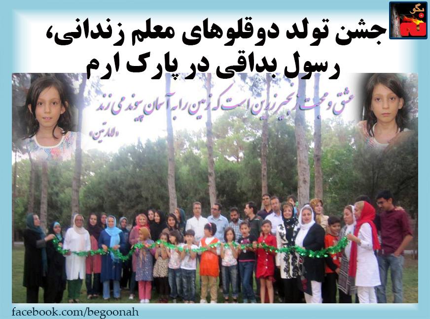#بگونه: روز یکشنبه بیست وچهارم خرداد ماه گروهی از معلمان به دعوت کانون صنفی معلمان ایران در پارک ارم تهران جمع شده وبرای دوقلوهای نازنین رسول بداقی جشن تولد برگزار کردند. در این جشن هدیه انجمن صنفی معلمان مریوان، تقدیم همسر معلم زندانی رسول بداقی شد.