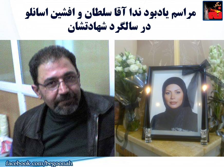 #بگونه: در تاریخ 28 خرداد بر مزار شهیدان راه آزادی ندا آقا سلطان و افشین اسانلو مراسمي برگزار مي شود. مراسمي در ماه خرداد كه همواره آبستن رویدادهای مهم تاریخی در ایران بوده است. از جمله یادآور جنبش مردمی ایران علیه حکومت فاشیستی ملایان در شرايطي كه شقه و شكاف درراس رژيم برسر نمايش انتخابات بارز شده بود مي باشد.