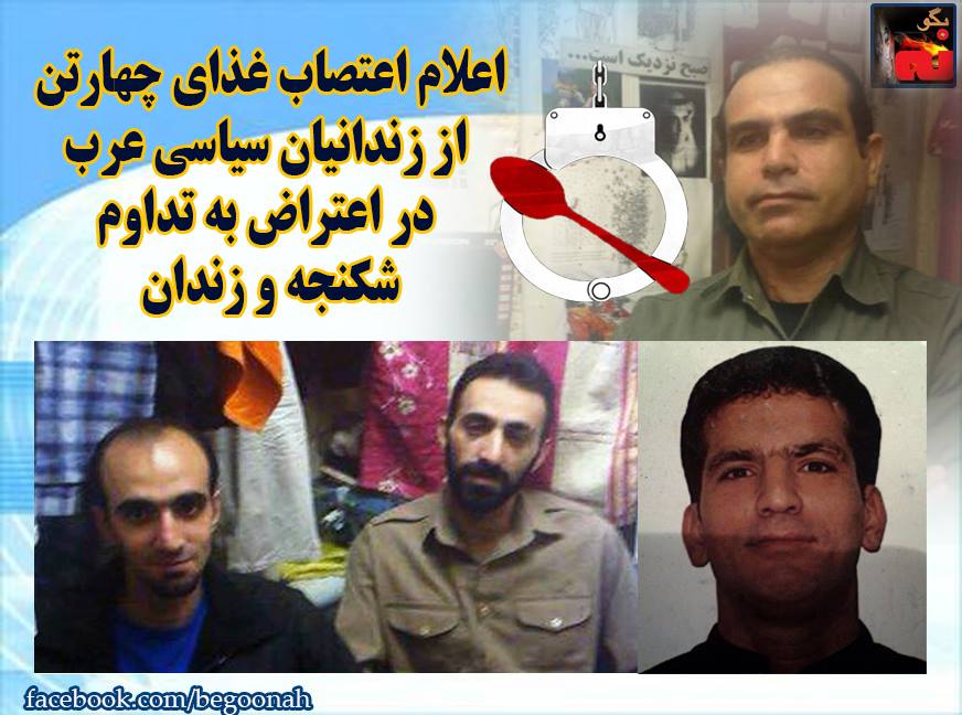 #بگونه :به گزارش منتشره در وبلاگ طلايه داران، چهار زنداني سياسي از هم وطنان عرب اهوازي در استان خوزستان، در اعراض به تداوم شكنجه و مرگ تدريجي و زندان غير قانوني و غير انساني در شكنجه گاههاي رژيم قرون وسطايي ولايت فقيه اعلام اعتصاب غذا كردند.