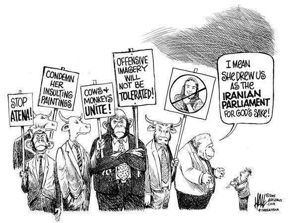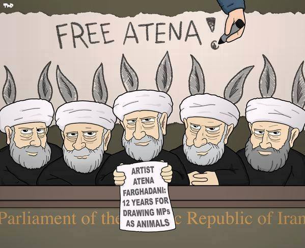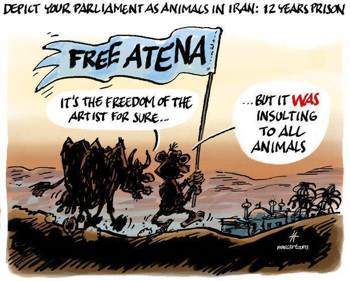 حمایت کارتونیستها از آتنا فرقدانی به دلیل طرحی از او که اعضای مجلس شورای اسلامی ایران را به ظاهر حیوانات نشان میداد صورت گرفته است. این طرح، به عنوان یکی از موارد اتهامی او در دادگاه مطرح شده و علت صدور بخشی از حکم حبس سنگین وی است.