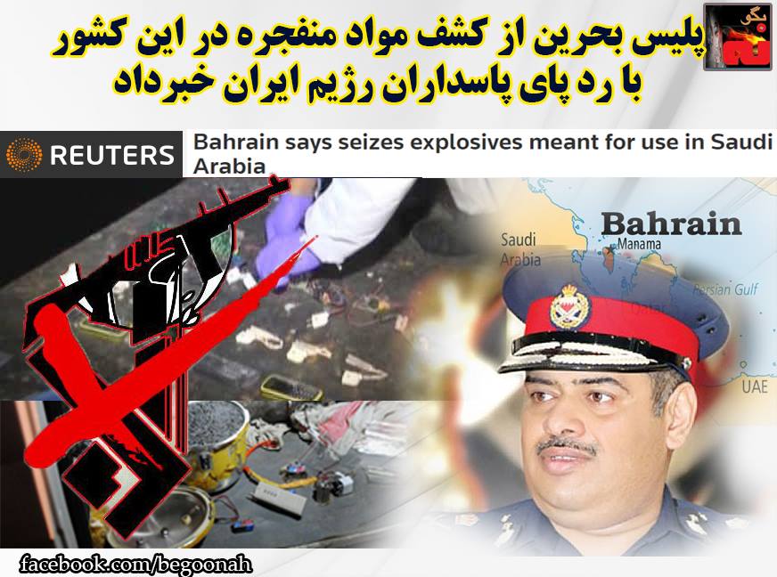 #بگونه: پلیس بحرین از کشف و ضبط مواد منفجره خبر داد كه به گفته مقامهای امنیتی این کشور گمان میرود این مواد برای ساخت بمب جهت تهاجمات تروریستی در بحرین و عربستان بوده است. رئيس سازمان امنيت بحرين در بيانيه اي اعلام كرد که شیوه ساخت مواد منفجره توقیف شده بهروشنی نشان میدهد که با شیوه کار گروههای تروریستی که به نیابت از سپاه پاسداران رژیم ایران عمل میکنند تشابه دارد.