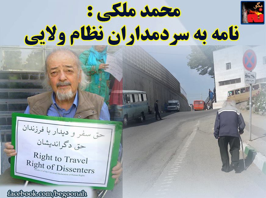 اینجانب محمد ملکی استاد بازنشسته دانشگاه تهران بارها مخالفت خود را با والیان نظام ولایی و ولایت مطلقه فقیه بدلیل عدم کفایت و صلاحیت در اداره امور کشور در یادداشت ها و مصاحبه هایم اعلام کرده ام و ابایی از ابراز صریح نظراتم نداشته و ندارم. در این روزها که در آستانه هشتاد و دو سالگی و پایان عمر با چند بیماری لاعلاج دست و پنجه نرم میکنم، میخواهم با فرزندانم و بویژه پسرم که هفت سال است از دیدارش محروم هستم دیدار کنم. پس از حدود ۶ ماه تلاش و شنیدن حرفهای دروغ و ضد و نقیض از سوی مقامات مسئول، دادستانی انقلاب تهران در تاریخ ۹۳/۸/۱۷ اعلام کرد که در تاریخ ۹۲/۱۰/۳ رفع ممنوع الخروجی بنده توسط دادستانی صادر شده اما من از طرف اداره حقوقی سپاه پاسداران ممنوع الخروج شده ام! آیا نظام ولایی تا این اندازه به حکومت نظامیان تبدیل شده که یک استاد دانشگاه از طرف سپاه ممنوع الخروج بشود؟ من از مقامات نظام ولایی و بویژه شخص رییس جمهور که ادعای مخالفت با دخالت نظامیان در امور سیاسی را دارد سوال میکنم که ممانعت از ابتدایی ترین حق انسانی یک دگراندیش به سپاه پاسداران چه ارتباطی دارد؟
