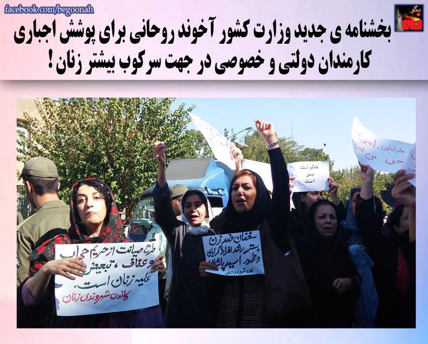 #بگونه : برخلاف شعارفریبکارانه اعتدال که آخوند روحانی می دهد ،وزارت کشور کابینه اش در جهت سرکوب بیشتر زنان در جامعه بخشنامه ای را در مورد حجاب کارمندان دولت صادر نموده است و در این دستور العمل کارمندان به ویژه زنان را در محدودیت هر چه بیشتر در انتخاب پوشش قرار داده است .