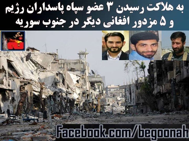 #بگونه: به گزارش خبرگزاريهاى حکومتی رژیم ايران، 3 تن ديگر از اعضاى سپاه پاسداران رژیم در جاده دمشق – درعا در جنوب سوریه به نامهای محمد حمیدی (با لقب ابوزینب)، حسن غفاری و علی امرائی (حسین ذاکری) و 5 افغانى عضو لشكر «فاطميون» رژیم توسط نیروهای آزادیخش سوریه علیه دیکتاتوری بشار اسد، به هلاکت رسیدند.
