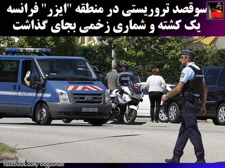 #بگونه: بر اساس اخبار گزارش شده از منابع فرانسوی، پلیس فرانسه از انفجار دو کپسول گاز در کارخانۀ «ایر پرودوکتس» واقع در منطقۀ «ایزر» در نزدیکی شهر «لییون» خبر داد و گفت که یک یا احتمالاً دو نفر در این سوءقصد دست داشته اند. در نتیجۀ این انفجار یک نفر کشته و شماری زخمی شدند.