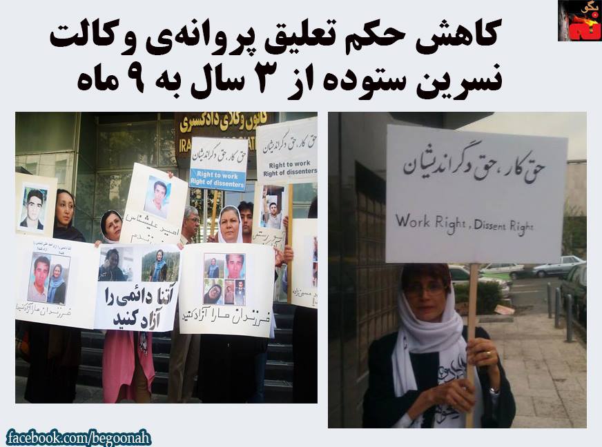 نسرین ستوده در صفحه ی فیسبوکش نوشت : بر اساس حکم جدیدی که از شعبه دوم دادگاه انتظامی وکلا صادر و دیروز 4 تیر 94 ابلاغ شد, حکم تعلیق پروانهی وکالتم از 3 سال به 9 ماه کاهش پیدا کرده است. بدین ترتیب امیدوارم با توجه به پایان 9 ماه از زمان صدور حکم قبلی, طی روزهای آینده نسبت به تمدید پروانه و پایان تحصن اقدام نمایم.