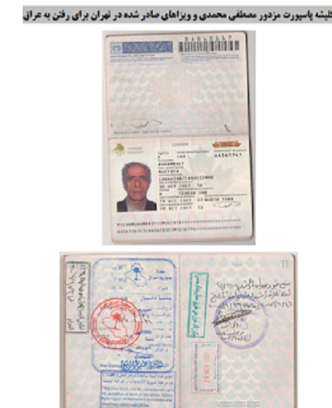 شايان يادآوريست كه مزدور مصطفي محمدي كه سالها است در خدمت اطلاعات ملايان قرار دارد از 11 سال پيش به شكنجه رواني دخترش مجاهد خلق سميه محمدي و ديگر مجاهدان اشرف پرداخت. وي يكي از گردانندگان كارزار شكنجه رواني با 320 بلندگو در سالهاي 1388 تا 1390 بود. عكس ها و كليپ هاي عربده كشي هاي او در مقابل اشرف و تهديد به كشن مجاهدين و به آتش كشيدن اشرف بارها از تلويزيون ملي ايران سيماي آزادي پخش شده است. او به فرموده و ابلهانه ميخواهد همان سناريوي جنايتكارانه را در پاريس پياده كند. او عليرغم اينكه سيتي زن كانادا است قبل از رفتن به عراق به تهران رفته و در آنجا توسط وزارت اطلاعات نسبت به ماموريت توجيه شد. جالب اين كه ويزاي عراق را هم از تهران دريافت كرده است. كليشه پاسپورت كانادايي او و كليشه دو ويزاي عراق كه توسط سفارت عراق در تهران، يكي در تاريخ 21 اكتبر 2007 و ديگري در 23 نوامبر 2008 همراه با مهرهاي ورود و اقامت وي در عراق ضميمه است.
