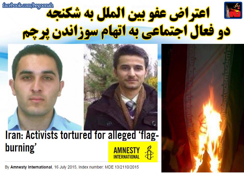 #بگونه: سازمان عفو بین الملل طى بیانیه اى صدور حکم حبس براى طه کرمانى و حسین على محمدى را محکوم کرد، این دو فعال اجتماعی به اتهام سوزاندن پرچم رژیم خرچنگ نشان رژیم آخوندی، هر کدام به ده سال حبس محکوم شده اند. عفو بین الملل اظهار نگرانى کرده است که این مجازات ها “ناعادلانه”، “با انگیزه سیاسى” و “بر اساس اعترافات تحت شکنجه” صادر شده باشد.