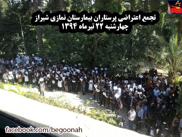 #بگونه: به گزارش خبرگزاری حکومتی ایلنا از شیراز، روز چهارشنبه پرستاران بیمارستان نمازی در اعتراض به طرح رژیم موسوم به قاصدک در صحن این بیمارستان تجمع کرده و شعار می دادند :»پرداخت مبتنی بر سلیقه نمیخواهیم»، «پرستار بیدار است عدالت در خواب است» و «نه قاصدک نه شاپرک فقط اجرای تعرفه». آنها همچنین خواستار حضور محمدهادی ایمانیه، رییس دانشگاه علوم پزشکی شیراز در جمع خود شدند.