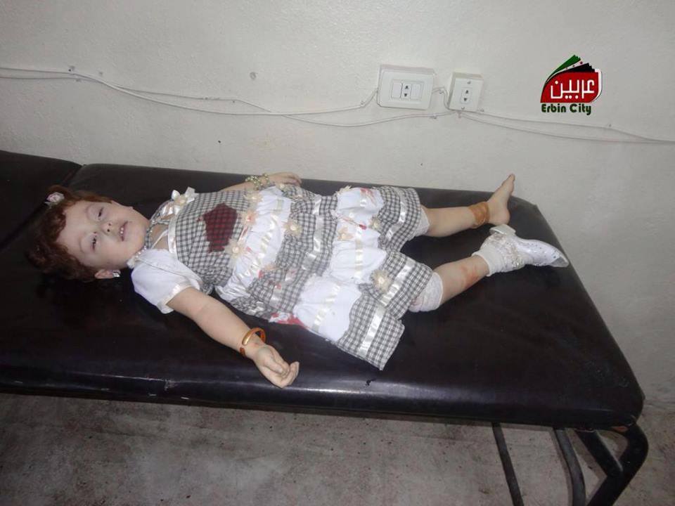 عیدی بشار اسد به کودکان سوری #بگونه: تصویر دلخراش از دختربچه ای که در لباس عید در حمله نیروهای اسد به حومه دمشق کشته شده است. Syrian little girl «Salam Karnaba» killed in her Eid clothes, among 12 victims of airstrikes on Erbeen rural Damascus. #ایران #سوریه