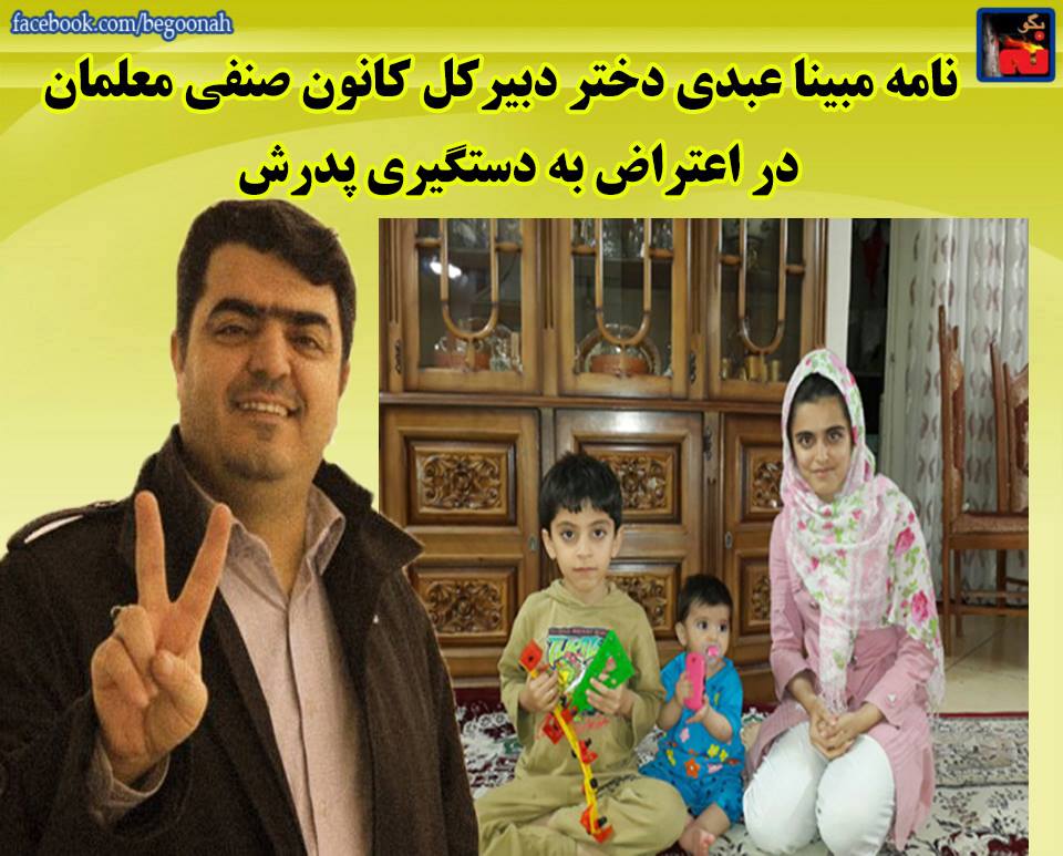 #بگونه: بر اساس نامه ای که در وبسایت حقوق معلم و کارگر منتشر شده است، دختر 16 ساله اسماعیل عبدی، دبیر کل کانون صنفی معلمان، طی نامه ای به رییس شعبه دوم بازپرسی رژیم موسوم به قاضی خورشیدی، خواستار آزادی پدر خود از زندان شد. مبینا عبدی دختر اسماعیل عبدی در این نامه می نویسد :